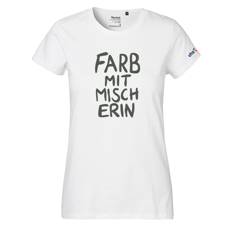 Klassisches weißes Damen Shirt mit rundhals Ausschnitt, leichter Taillierung und kurzen Ärmeln, aus 100% Fairtrade zertifizierter Bio-Baumwolle. Bedruckt mit dem aktuellen Kampagnemotiv "Farbmitmischerin" und einem dezenten vhs Logo auf dem Ärmel. Die Shirts fallen klein aus, wir empfehlen eine Nummer größer zu bestellen.