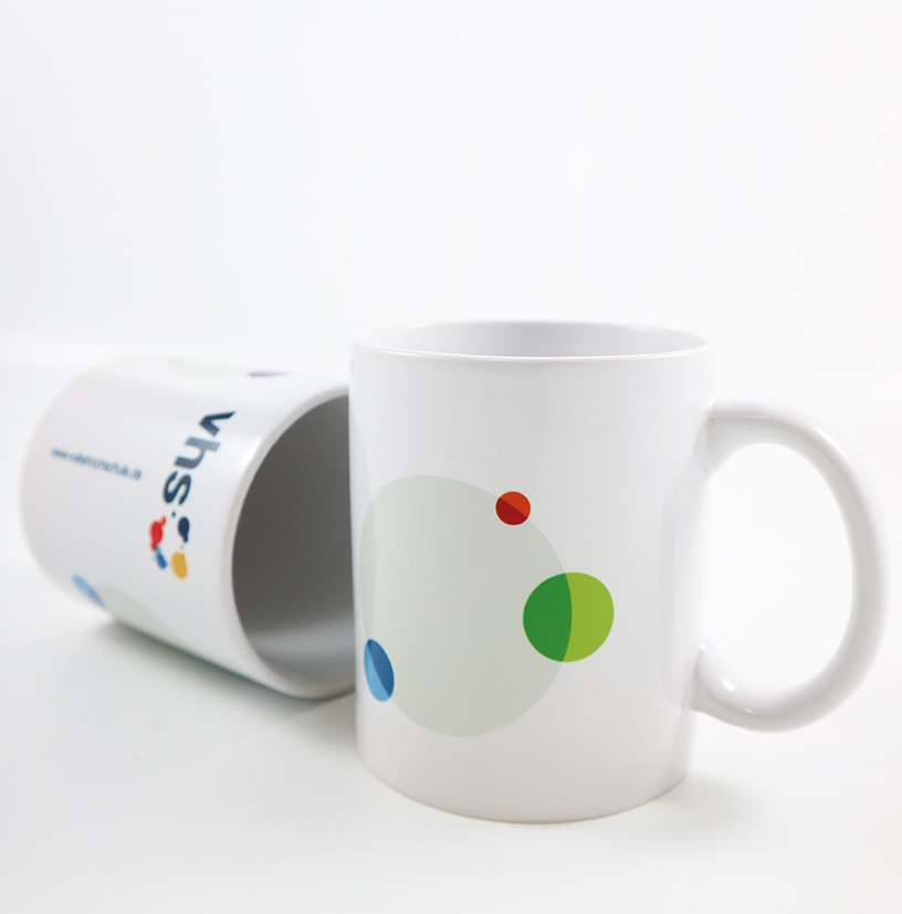 Steinguttasse PICS ONE, Weiß, mit rou bill Bodenmarke, Durchmesser: ca. 82 mm, Höhe: ca. 96 mm, Inhalt: ca. 0,3 l, Steingut DIN EN 1900, bunter Sublimationsdruck rundum mit Kreisen und vhs Logo individuell sowie www.volkshochschule.de (Motiv kann komplett individuell gestaltet werden auf Wunsch) / Mindestmenge 36 Stück