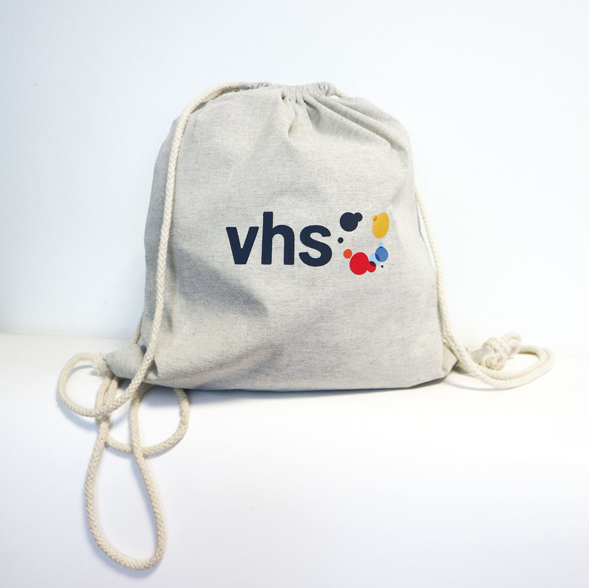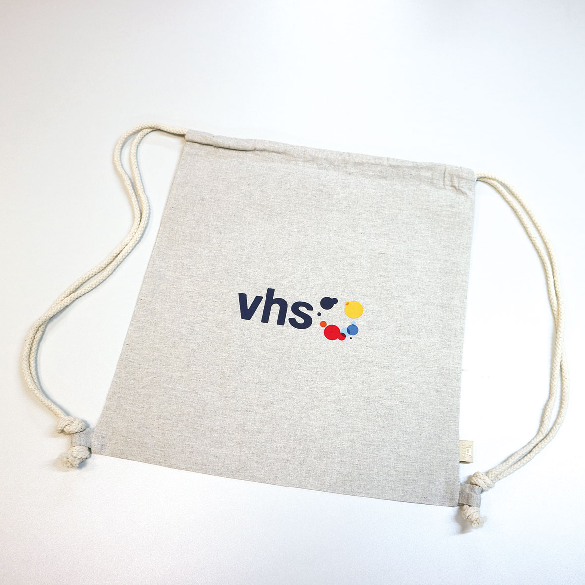 Leichter Zugbeutel aus pre-recycelter Baumwolle, naturfarben/ beige; Hauptfach mit Kordelzug. Der Beutel ist ca 42x38cm groß. Der Druck des vhs Logos ist bunt mittig auf dem Beutel.