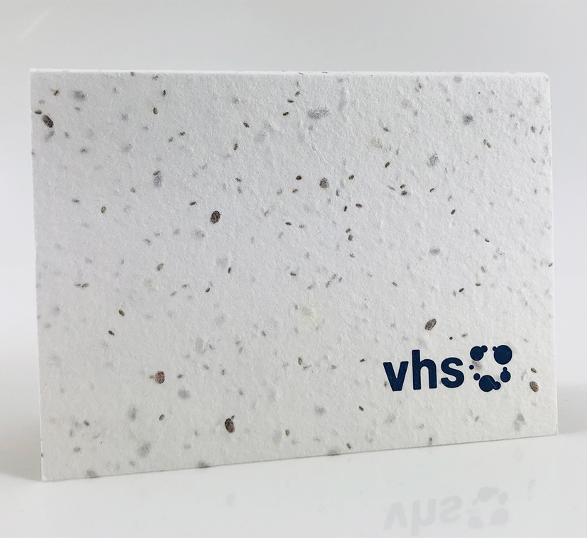 Innovativer Memoblock mit 50 Klebezetteln aus Graspapier. Das Softcover ist mit Samenpapier beschichtet. Die "grüne" Alternative zu traditionellen selbsthaftenden Klebezetteln. Nach Gebrauch kann das Cover eingepflanzt werden und es wachsen Wildblumen. Ein wirklich grünes und nachhaltiges Büroaccessoire. Logodruck vhs in Blau auf der Vorderseite des Softcovers. Hergestellt in der EU.