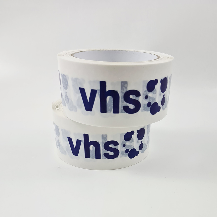 Selbbstklebebänder aus PVC-Folie weiß. 50 mm x 66 m, bedruckt mit vhs Logo in Dunkelblau, mit Naturkautschukkleber.