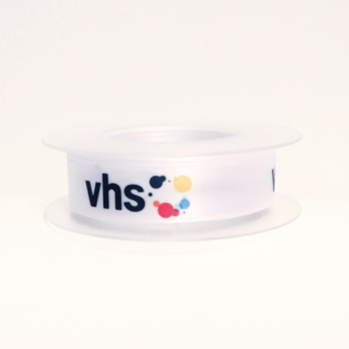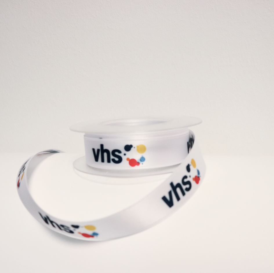 Doppelsatinband mit Webkante, 20 mm breit, mit endlos Druck des vhs Logos, 10 Meter auf einer Rolle mehr