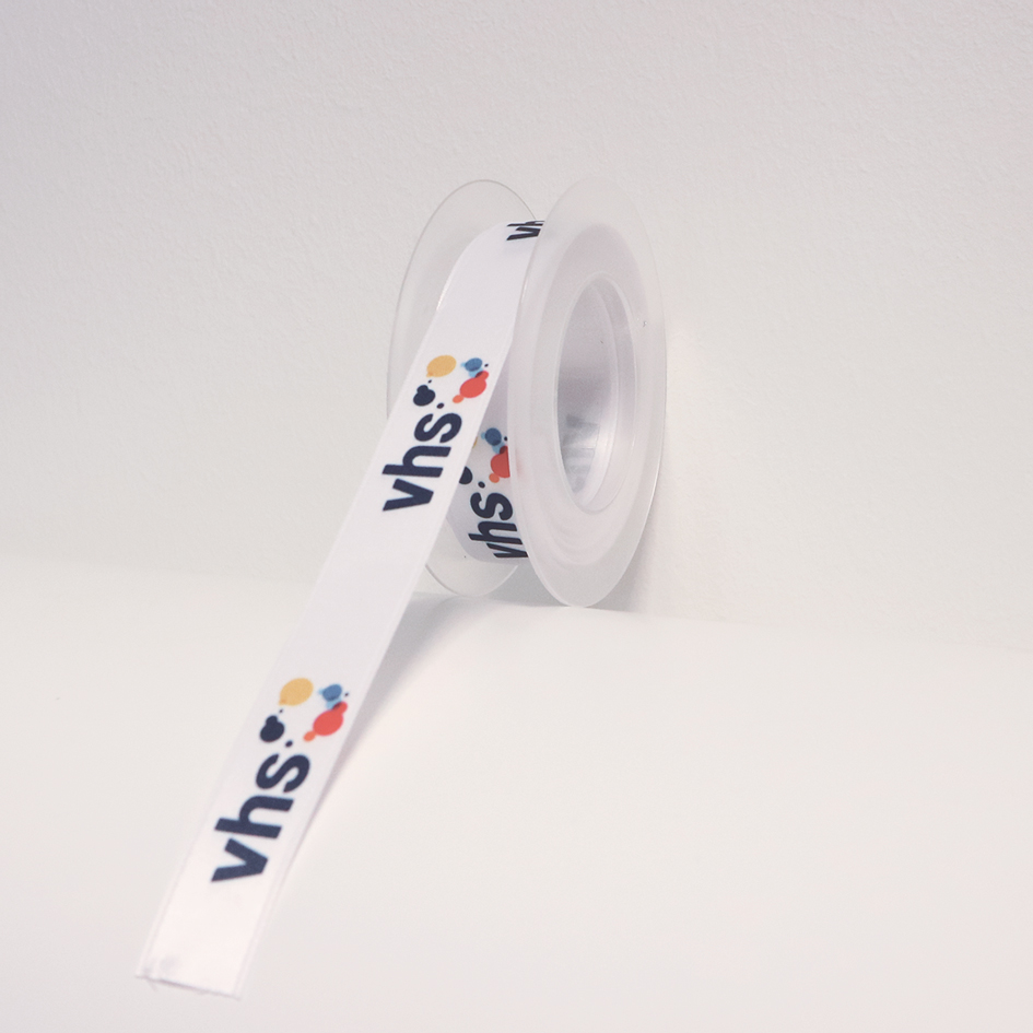 Doppelsatinband mit Webkante, 20 mm breit, mit endlos Druck des vhs Logos, 10 Meter auf einer Rolle